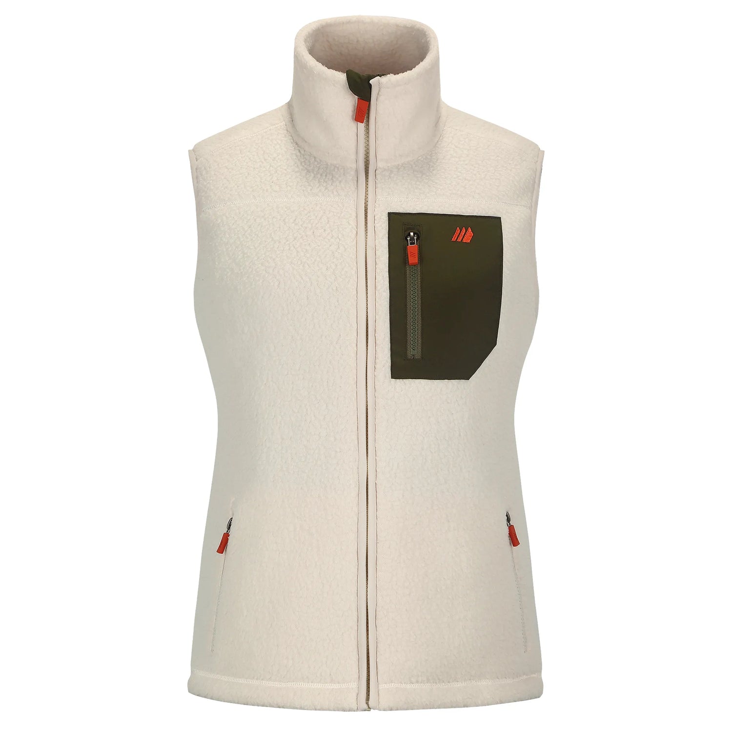 This vest is made of a soft pile fleece material that provides warmth and comfort during various outdoor activities like hiking. It can be worn as a standalone piece or as a middle layer for added insulation. The high collar has a gentle chin guard and elastic bands in the armholes for ease of movement. There are strategically placed pockets in the front, all of which have zipper closures.